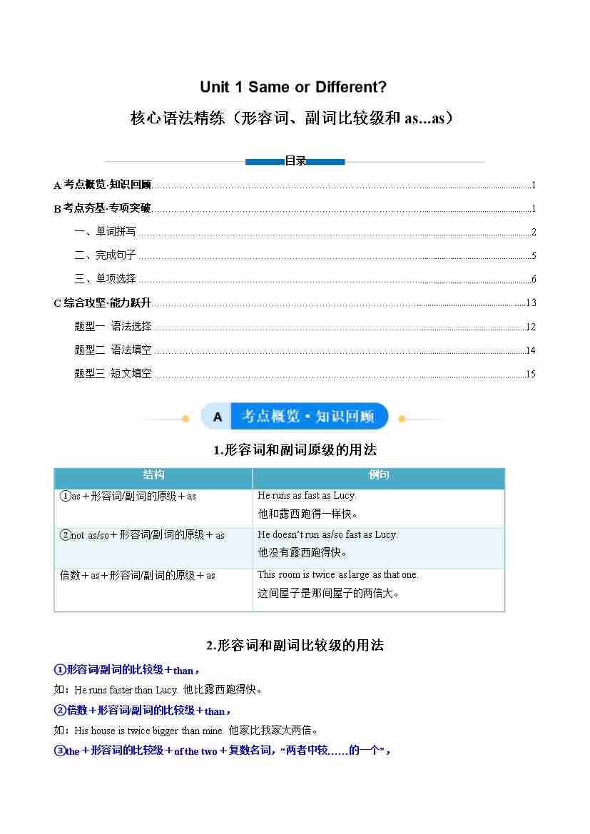Unit 1 Same or Different 形容词、副词比较级和as...as(单元核心语法精练)(解析版)