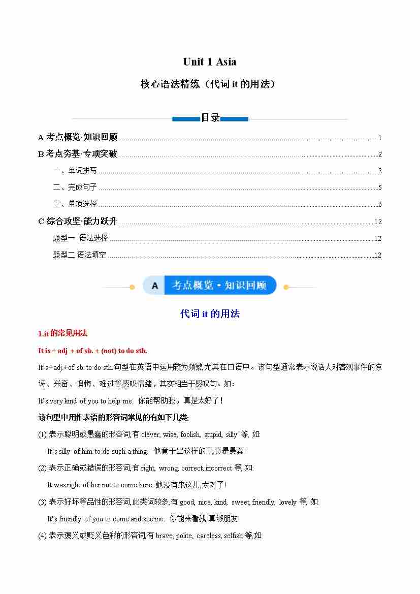 Unit 1 Asia代词it的用法(单元核心语法精练)(原卷版)