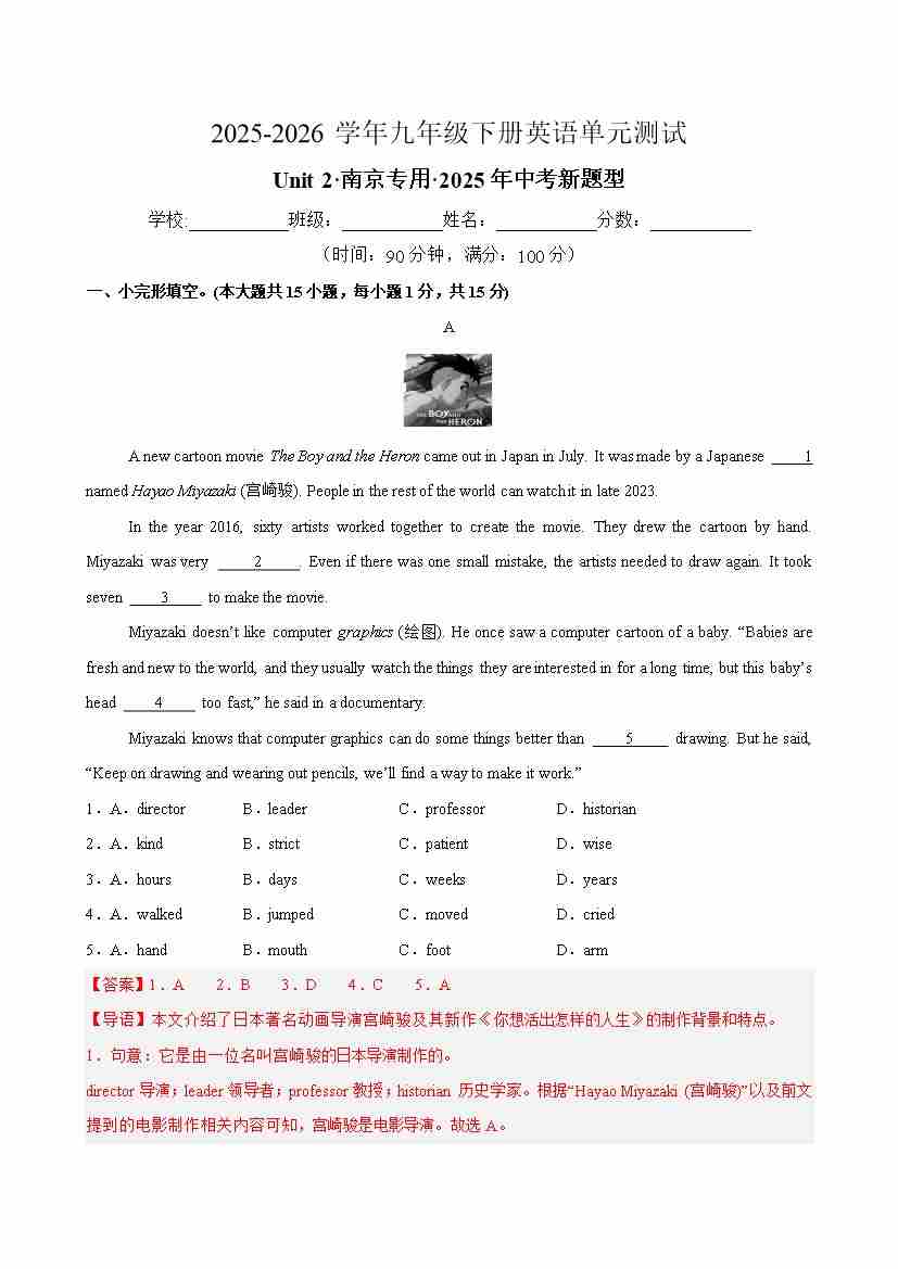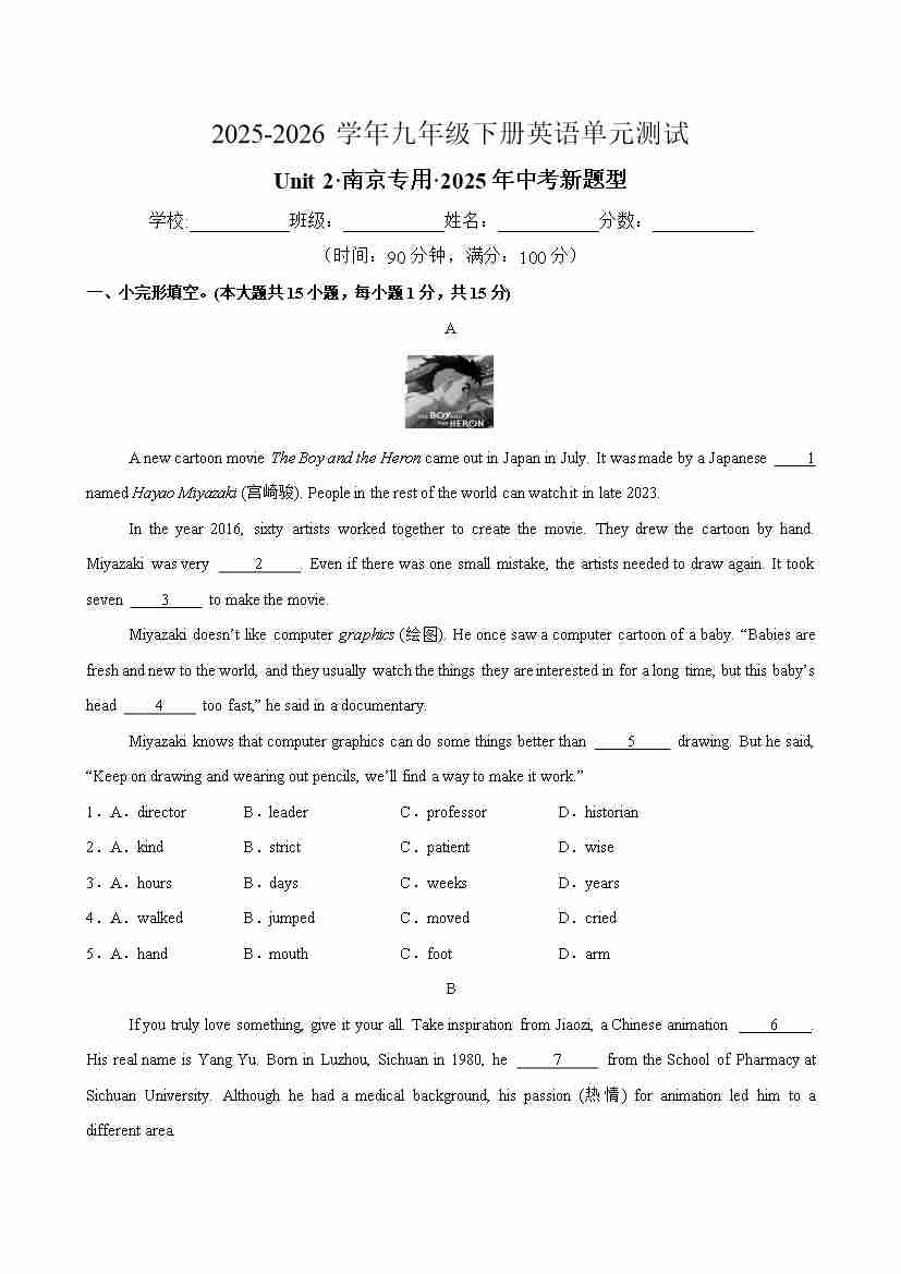 九年级英语下册Unit 2 Great people 单元测试(南京专用)(考试版A4)