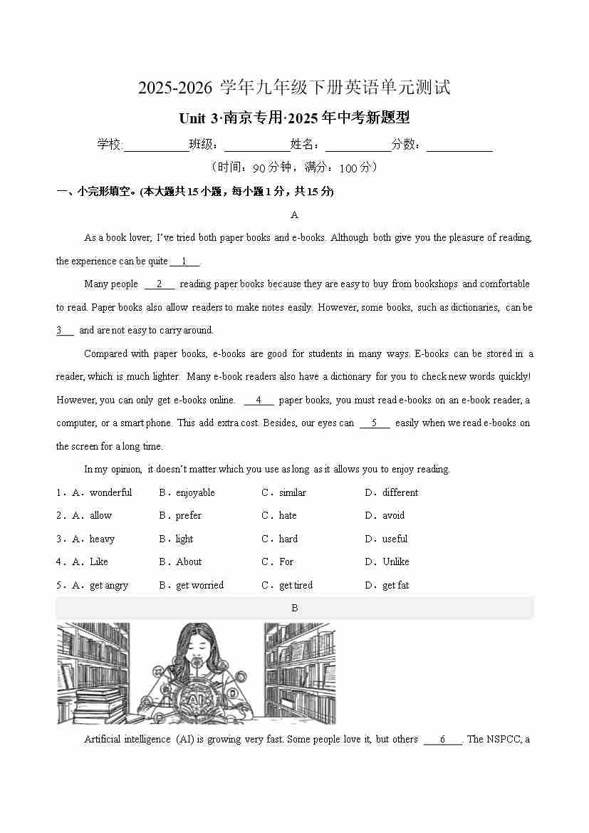 九年级英语下册Unit 3 Robots 单元测试(南京专用)(考试版A4)