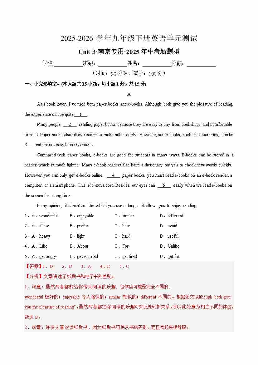 九年级英语下册Unit 2 单元测试·苏州专用(考试版A4)