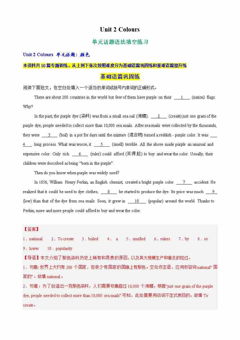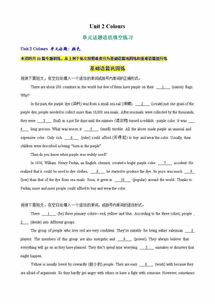 Unit 2 Colours 单元话题语法填空练习(教师版)