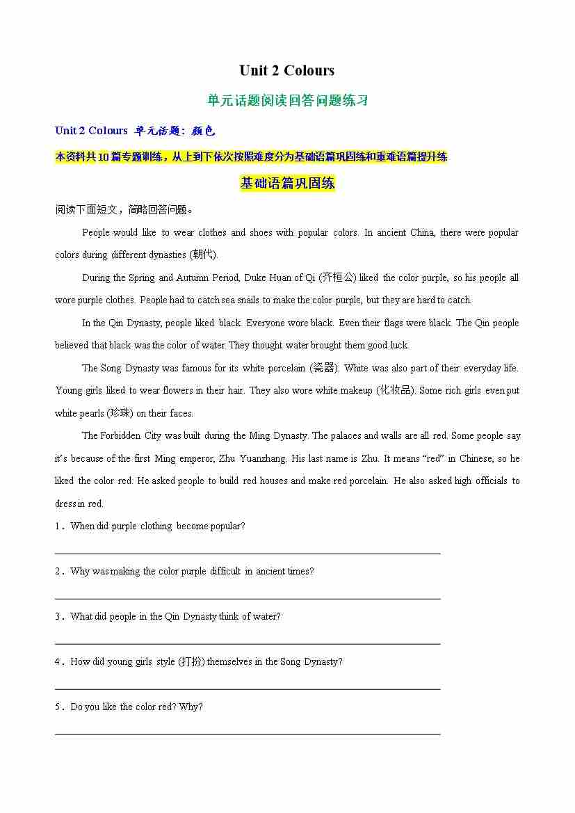 Unit 2 Colours 单元话题阅读回答问题练习(学生版)