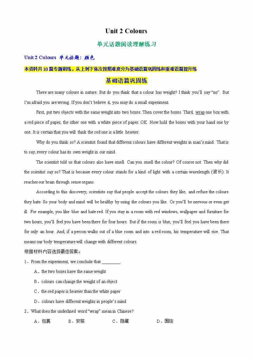 Unit 2 Colours 单元话题阅读理解练习(学生版)