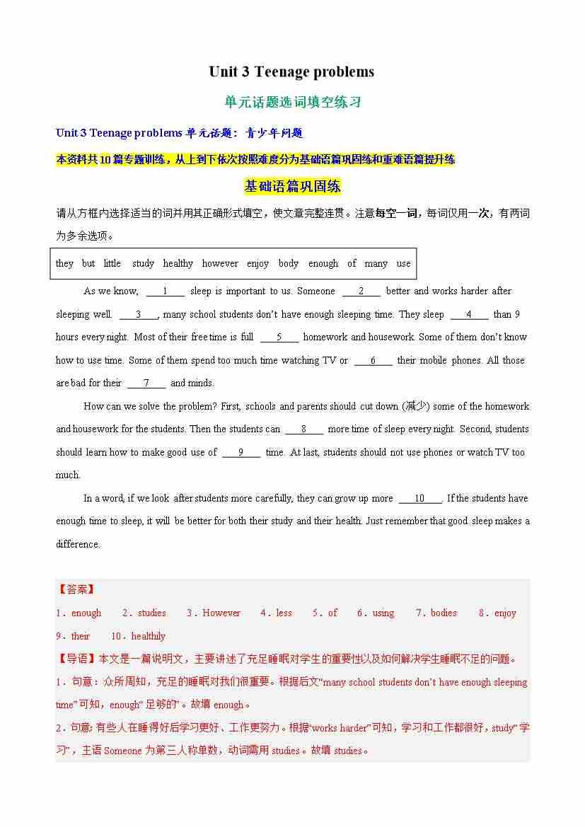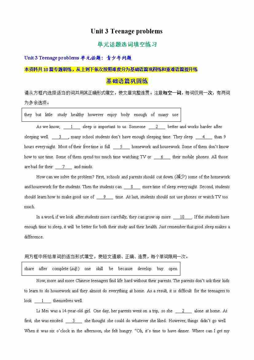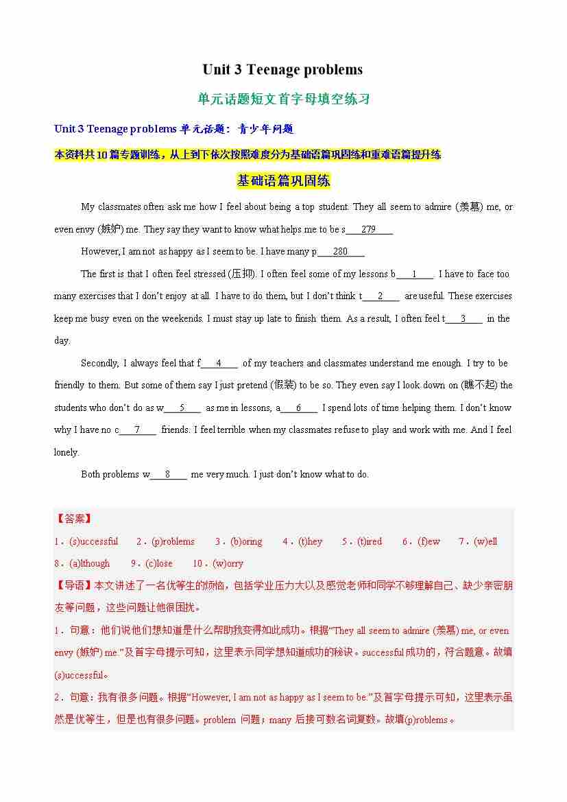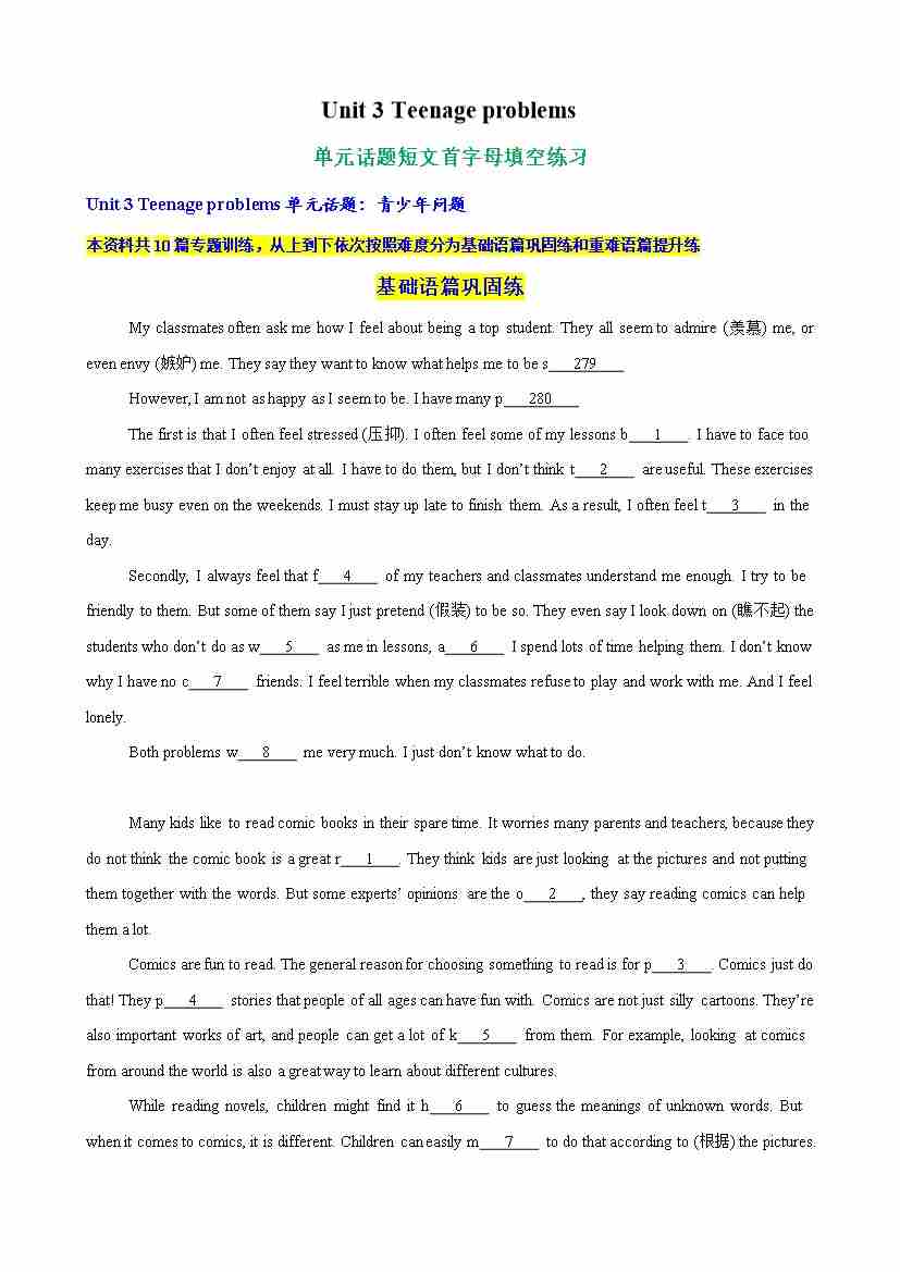 Unit 3 Teenage problems 单元话题短文首字母填空练习(学生版)