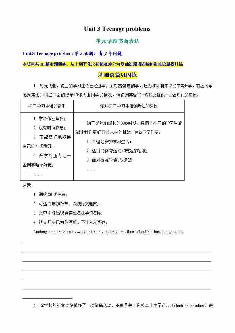 Unit 3 Teenage problems单元话题书面表达练习(学生版)