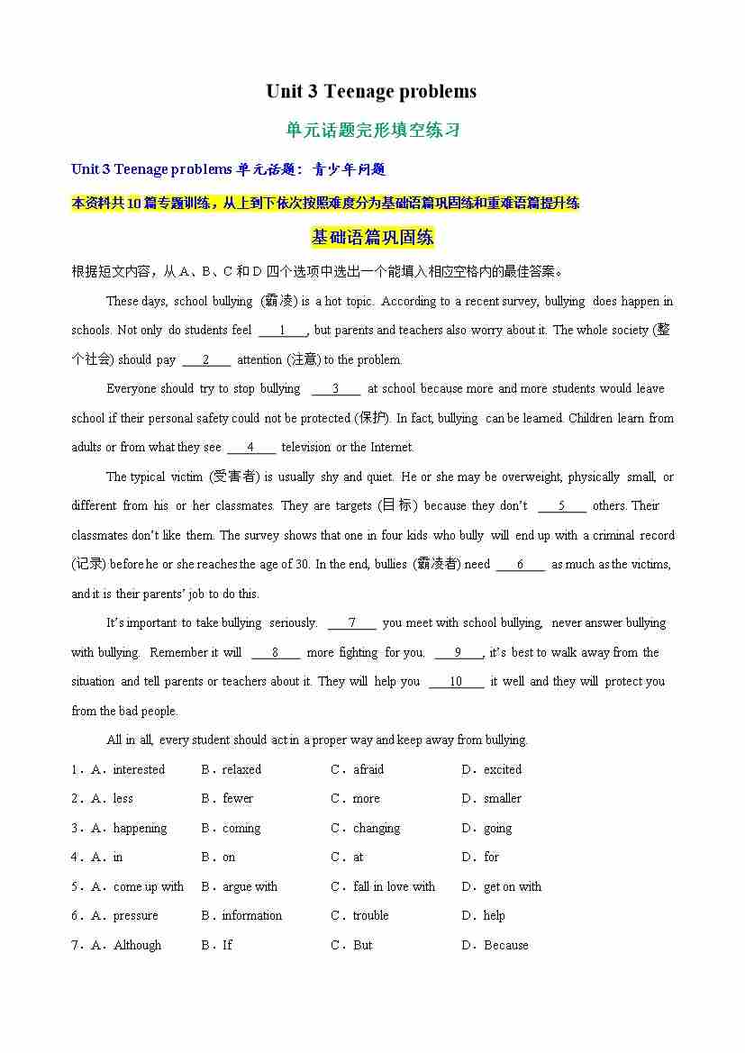 Unit 3 Teenage problems单元话题完形填空练习(学生版)