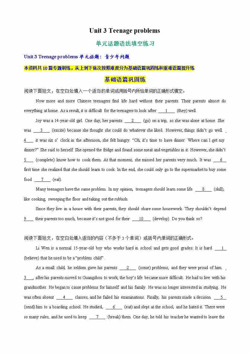 Unit 3 Teenage problems单元话题语法填空练习(学生版)
