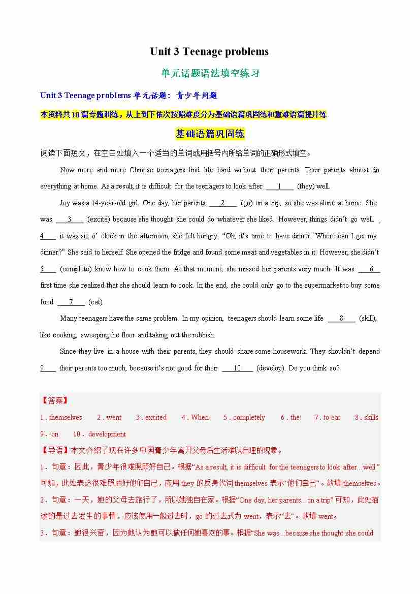 Unit 3 Teenage problems单元话题语法填空练习(教师版)