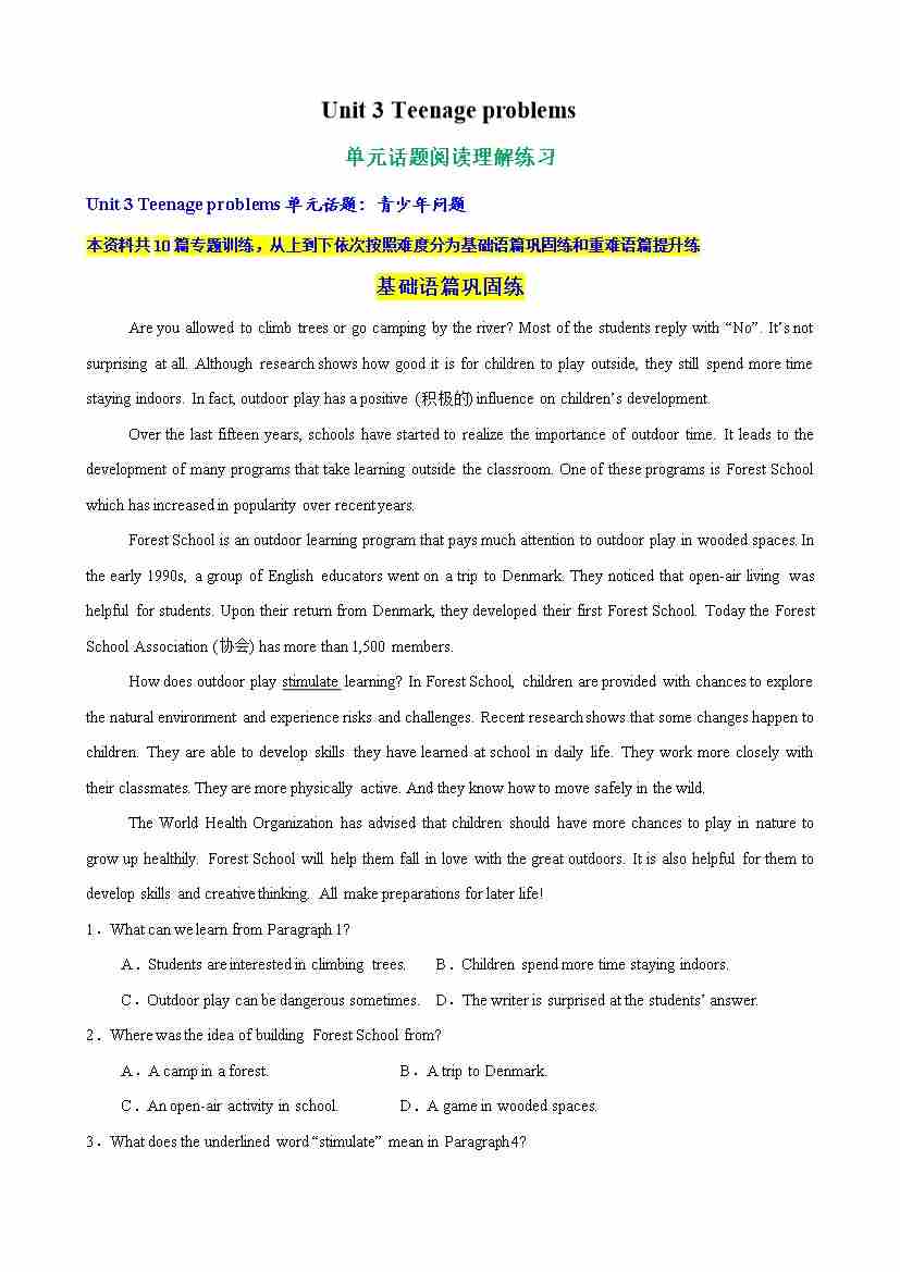 Unit 3 Teenage problems单元话题阅读理解练习(学生版)