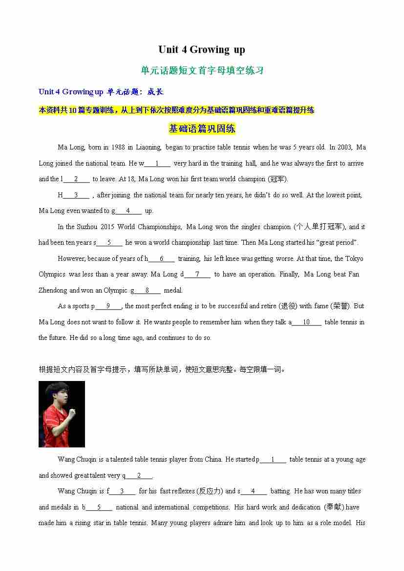 Unit 4 Growing up单元话题短文首字母填空练习(学生版)