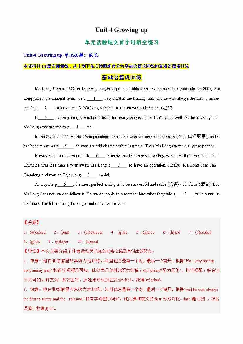 Unit 4 Growing up单元话题短文首字母填空练习(教师版)