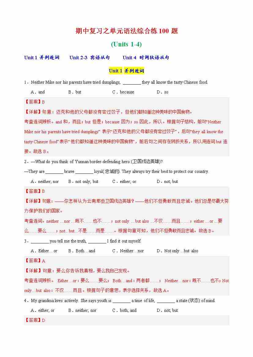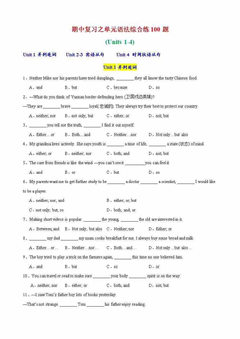 期中复习之单元语法综合练100题(Units 1-4)(教师版)