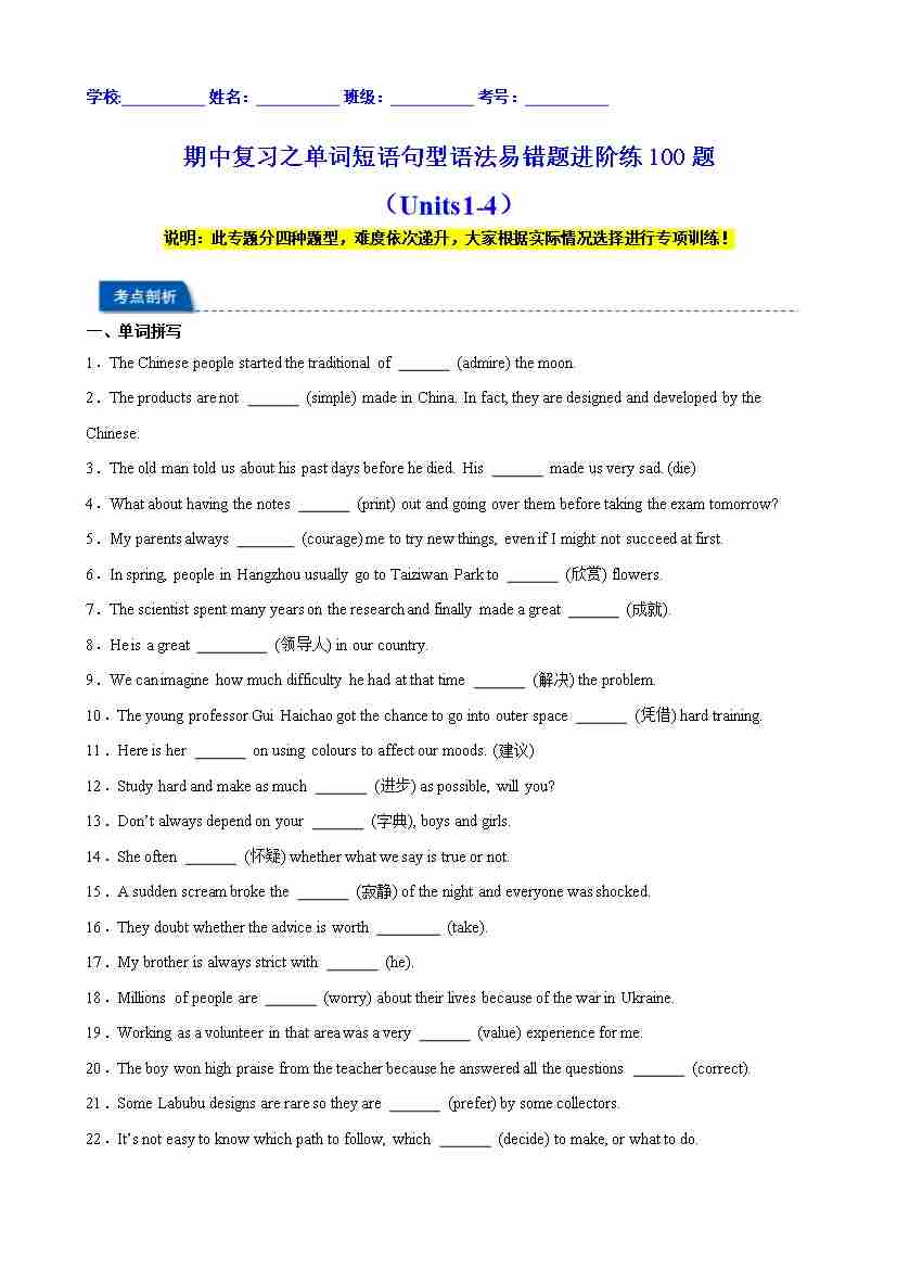 期中复习之单词短语句型语法易错题进阶练100题(Units1-4)(学生版)