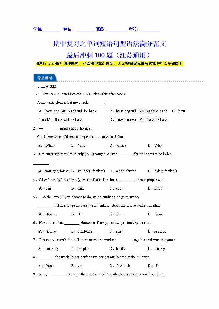 期中复习之单词短语句型语法满分范文最后冲刺100题(江苏通用)(学生版)
