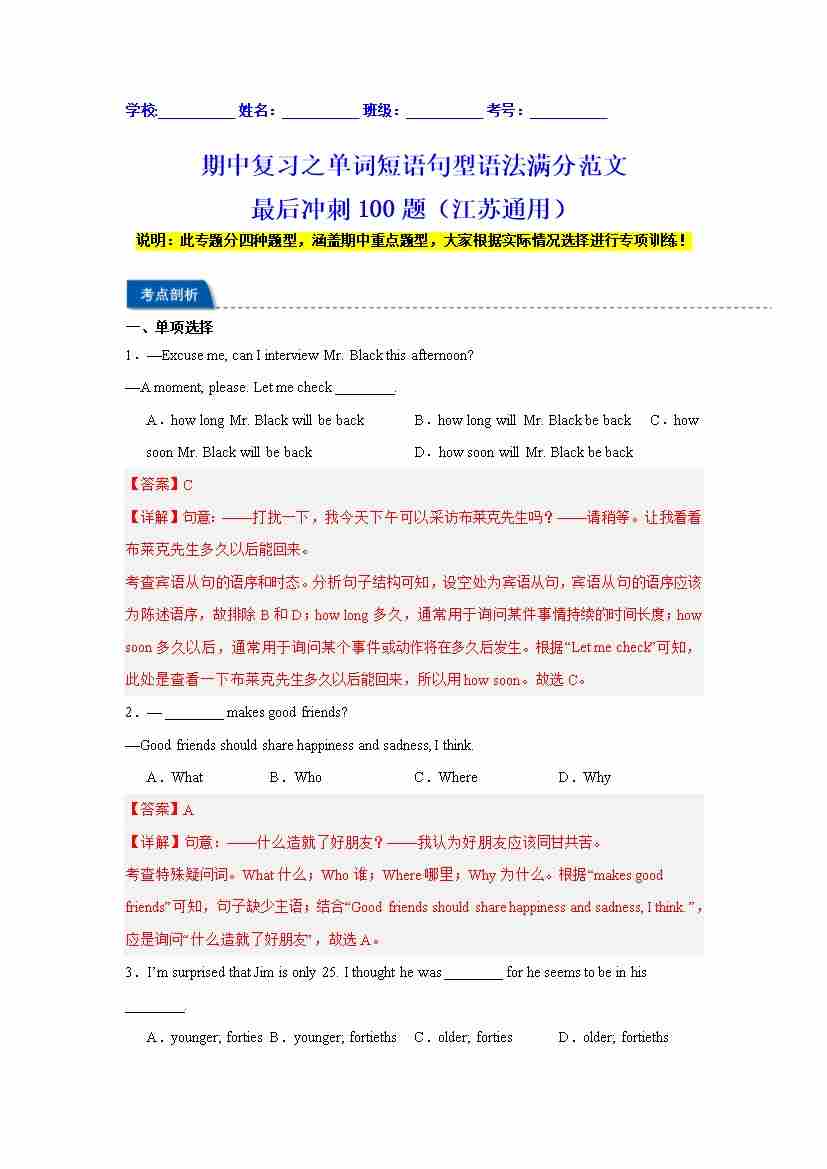 期中复习之单词短语句型语法满分范文最后冲刺100题(江苏通用)(教师版)