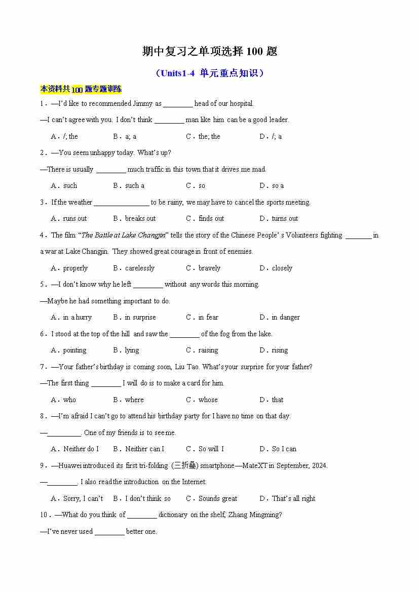 期中复习之单项选择100题(Units1-4单元重点知识)(学生版)