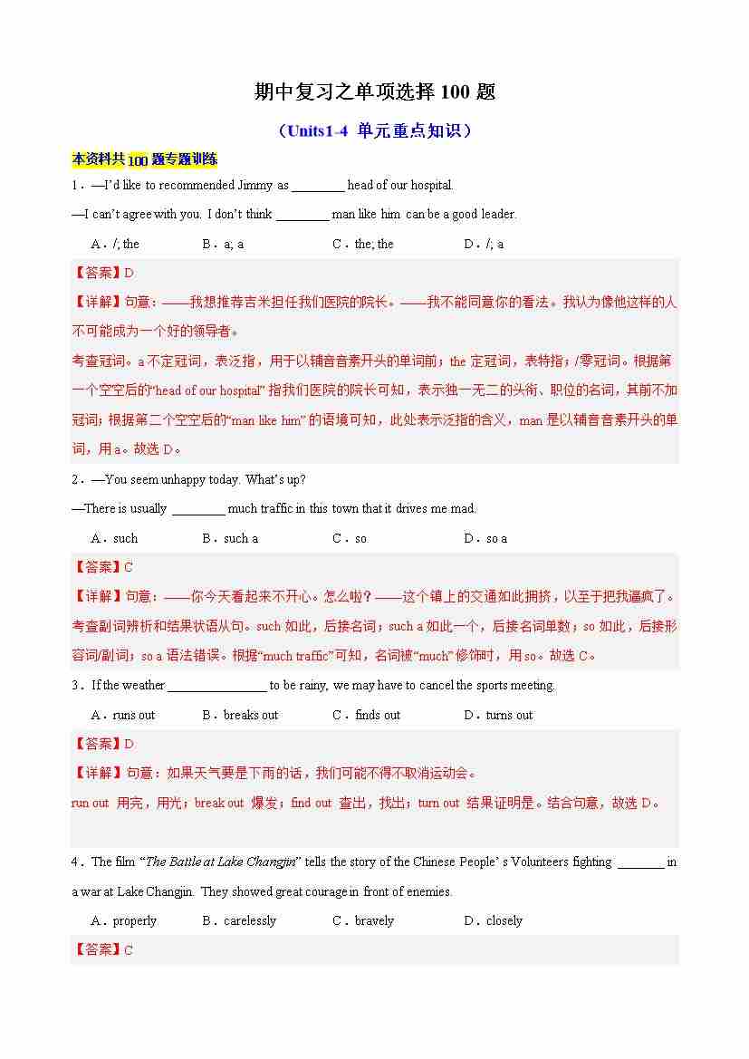 期中复习之单项选择100题(Units1-4单元重点知识)(教师版)