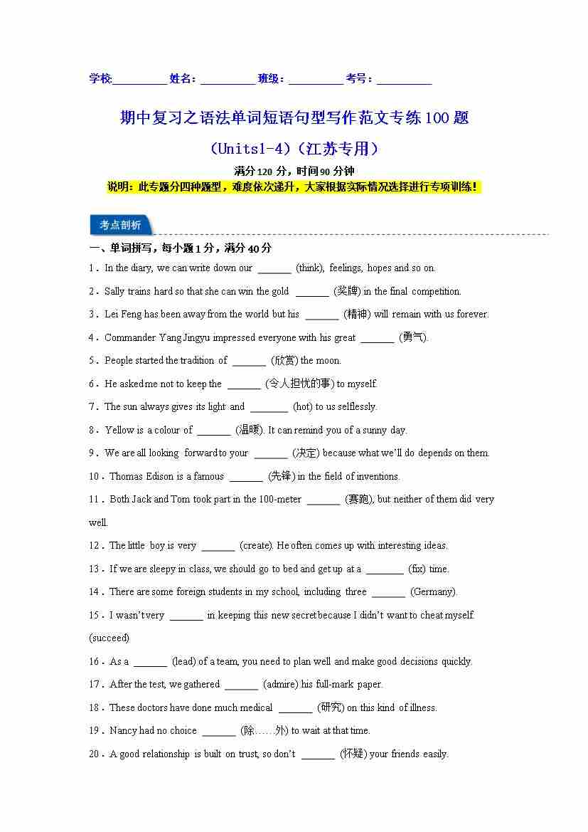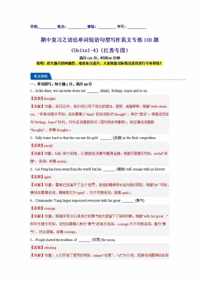 期中复习之语法单词短语句型写作范文专练100题(Units 1-4)(江苏专用)(教师版)