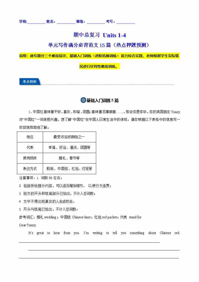 期中总复习 Units 1-4 单元写作满分必背范文15篇(热点押题预测)(学生版)