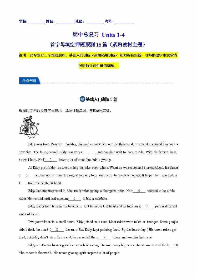 期中总复习 Units 1-4 首字母填空押题预测15篇(紧贴教材主题)(学生版)