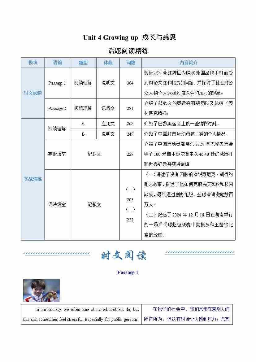 Unit 4 Growing up 成长与感恩(话题阅读精练)(原卷版)
