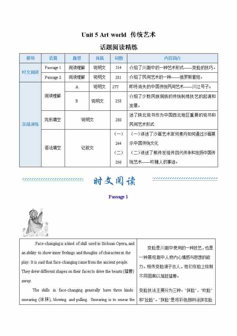 Unit 5 Art world 传统艺术(话题阅读精练)(解析版)