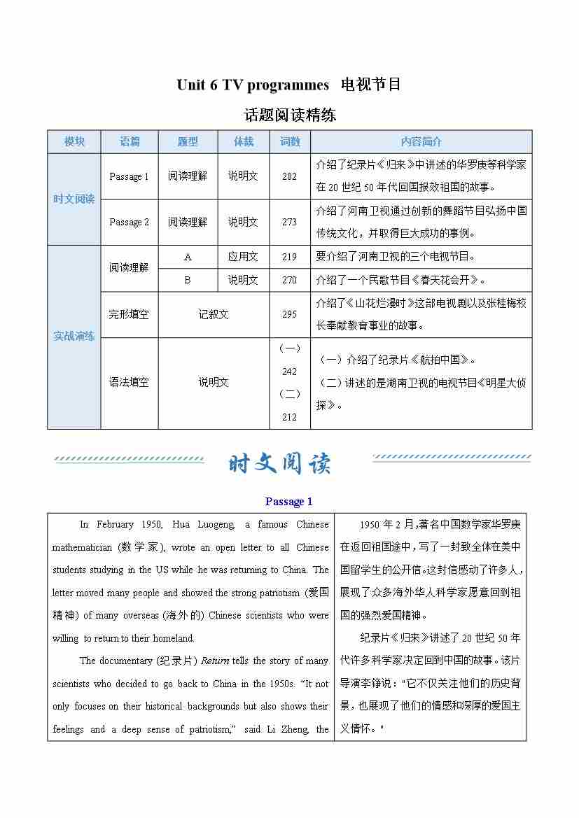 Unit 6 TV programmes 电视节目(话题阅读精练)(解析版)
