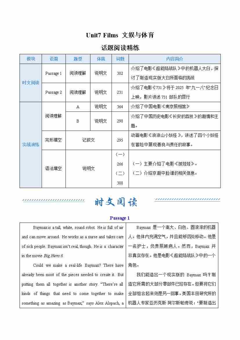 Unit 7 Films 文娱与体育(话题阅读精练)(解析版)