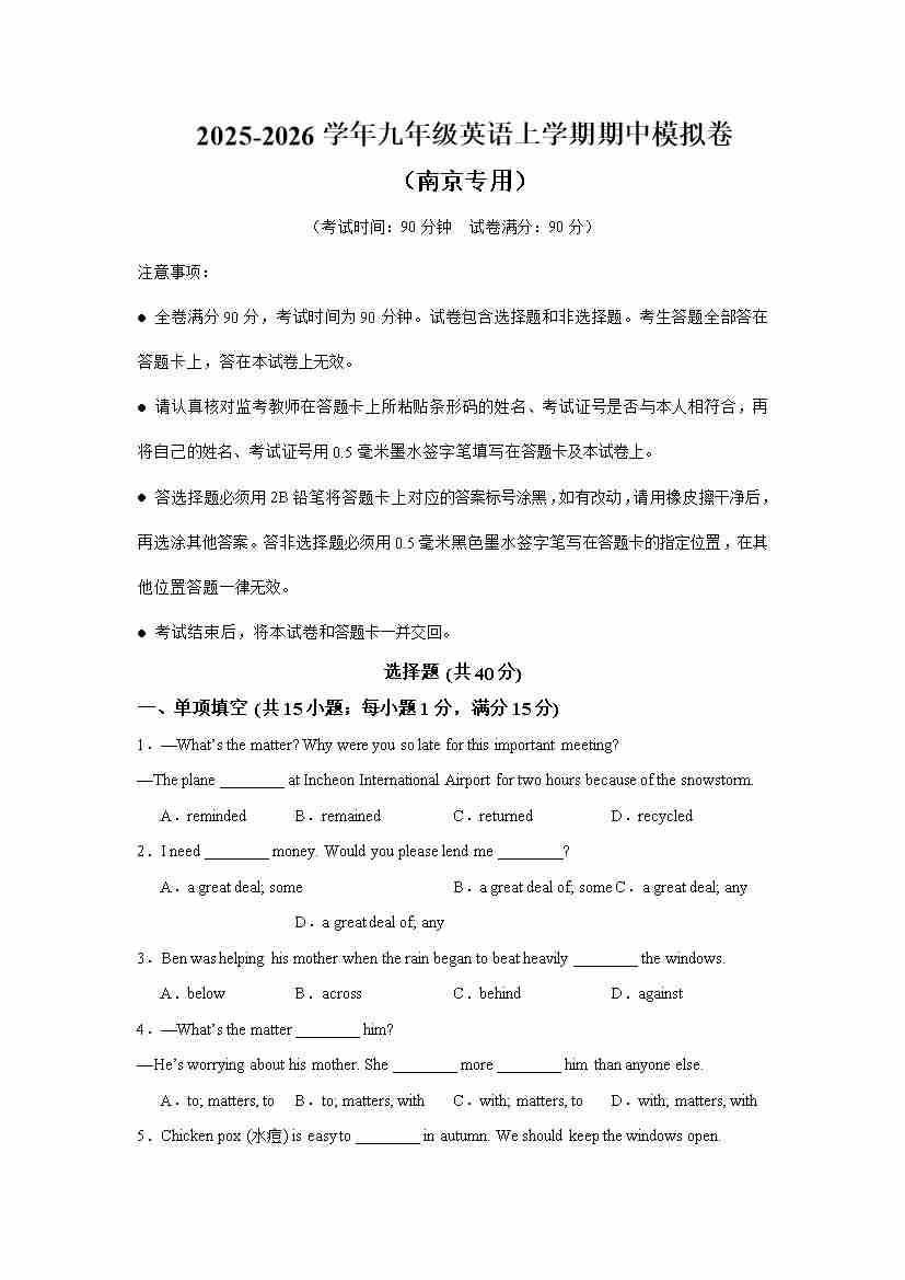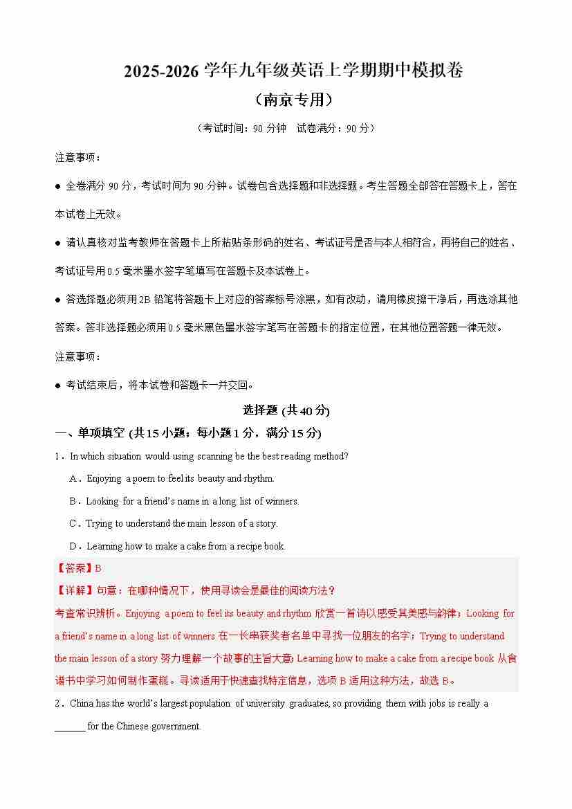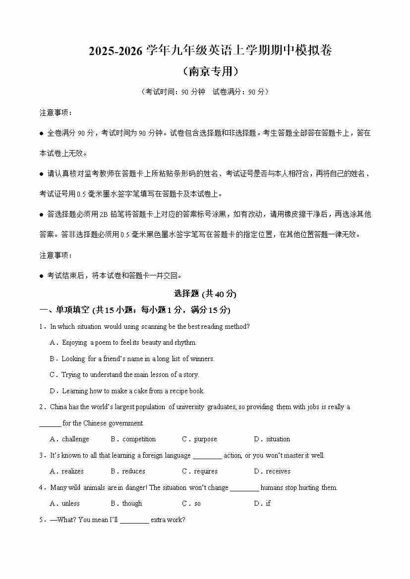 九年级英语上学期期中临考押题预测卷(南京专用)(学生版)