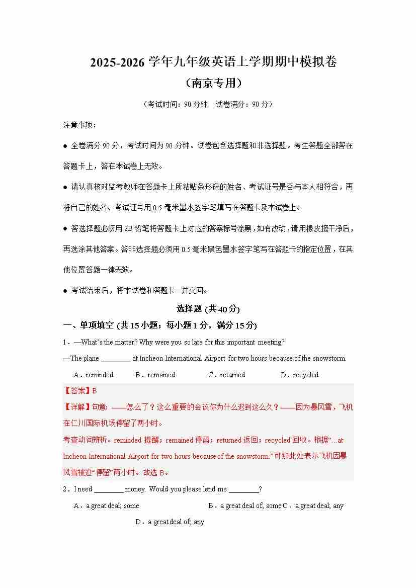 九年级英语上学期期中临考押题预测卷(南京专用)(教师版)