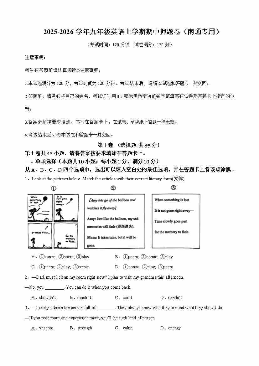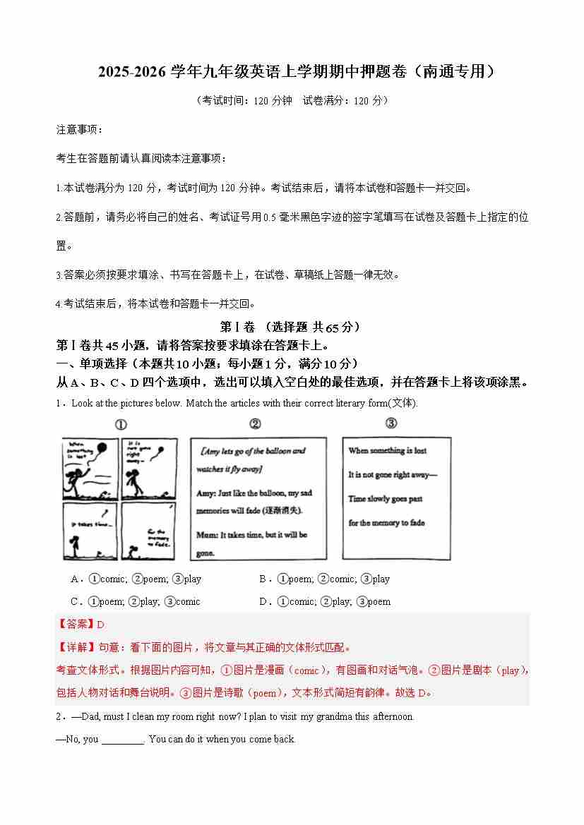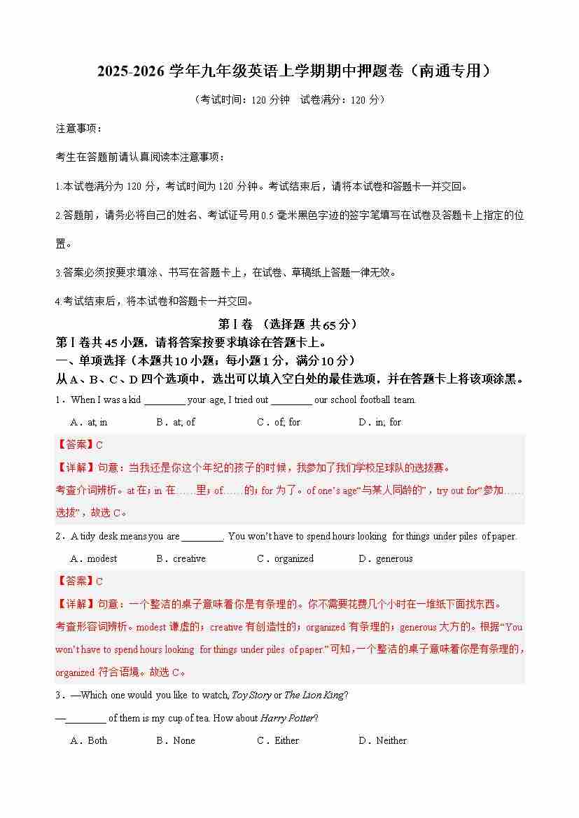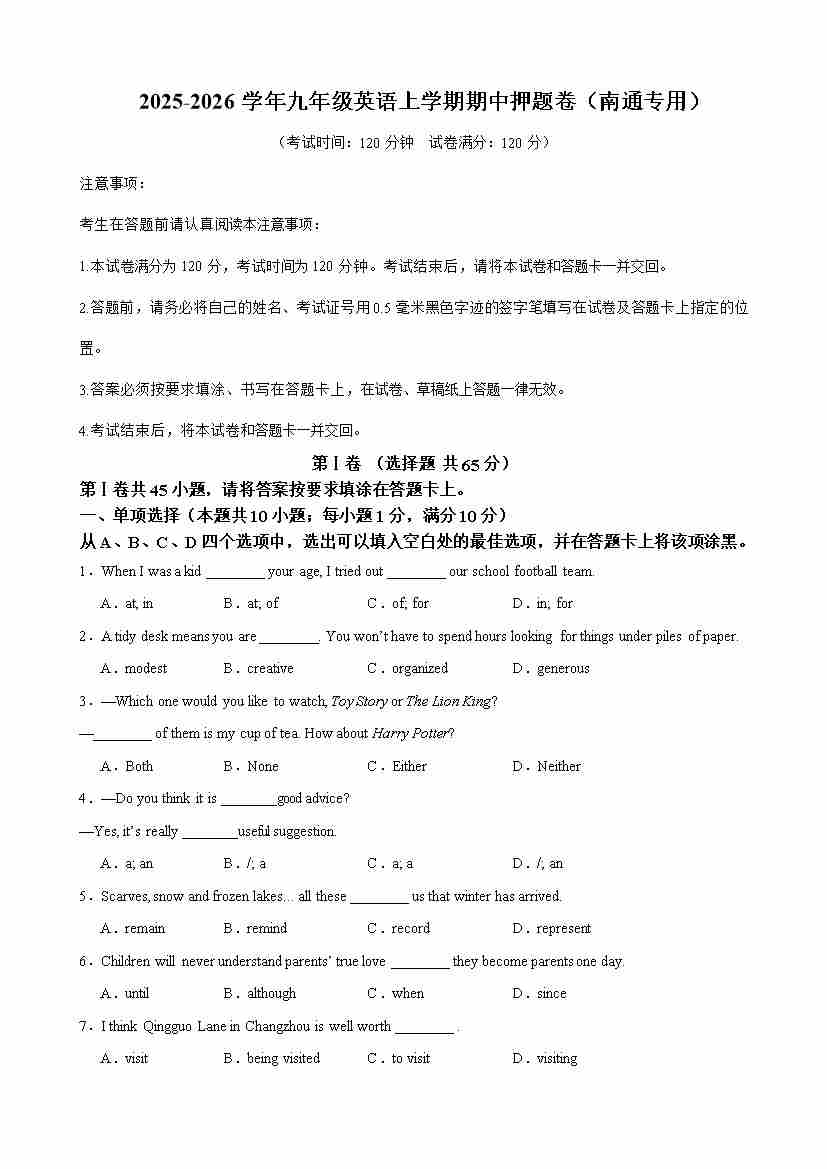 九年级英语上学期期中名校预测卷(南通专用)(学生版)
