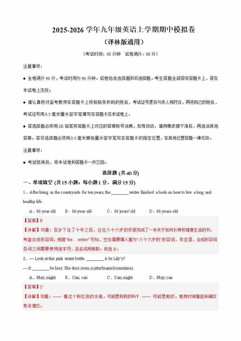 九年级英语上学期期中名校预测卷(南通专用)(教师版)