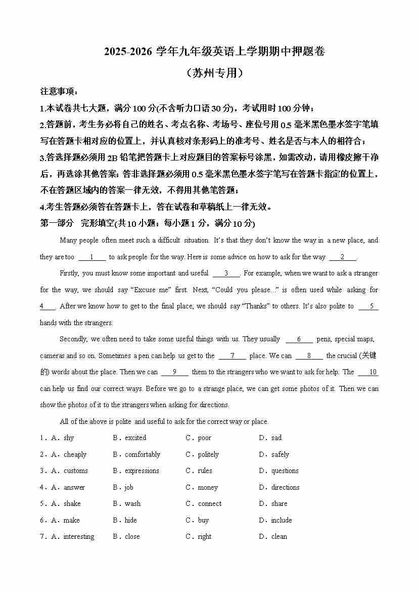 九年级英语上学期期中热点必刷卷(苏州卷)(学生版)