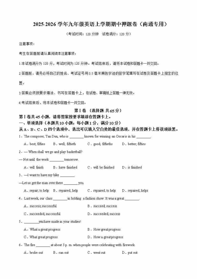 九年级英语上学期期中临考押题卷(南通专用)(学生版)