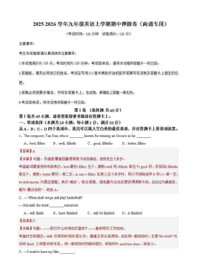 九年级英语上学期期中临考押题卷(南通专用)(教师版)