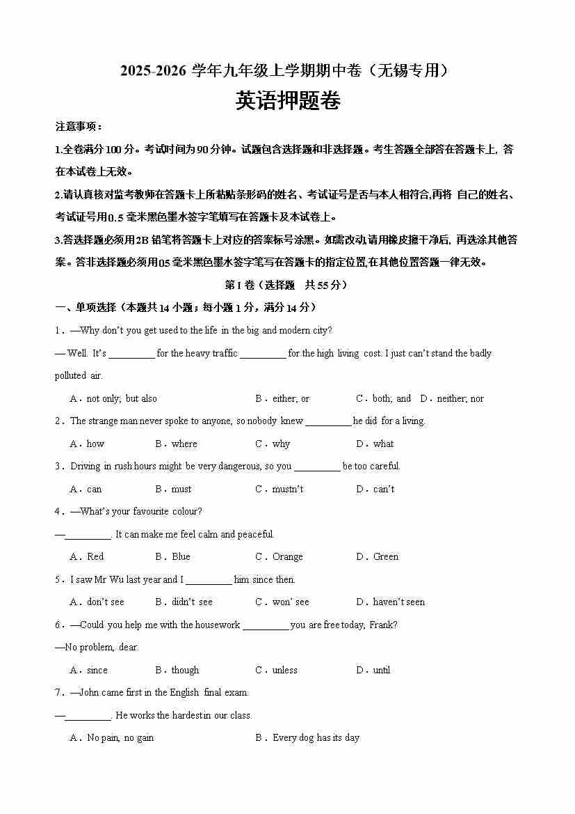 九年级英语上学期期中临考押题卷(无锡卷)(学生版)