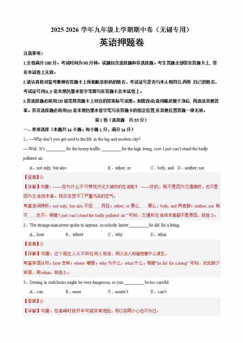 九年级英语上学期期中临考押题卷(无锡卷)(教师版)
