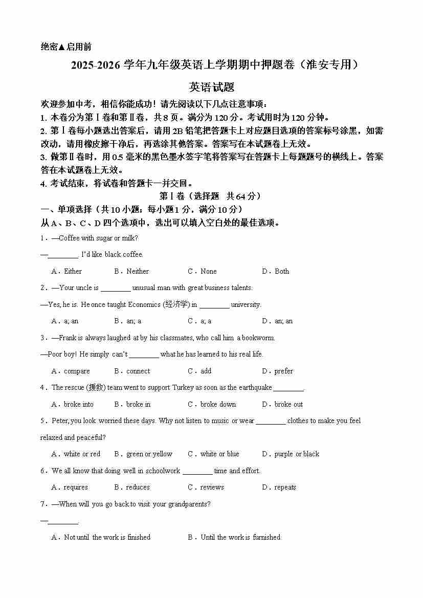 九年级英语上学期期中临考押题卷(淮安专用)(学生版)