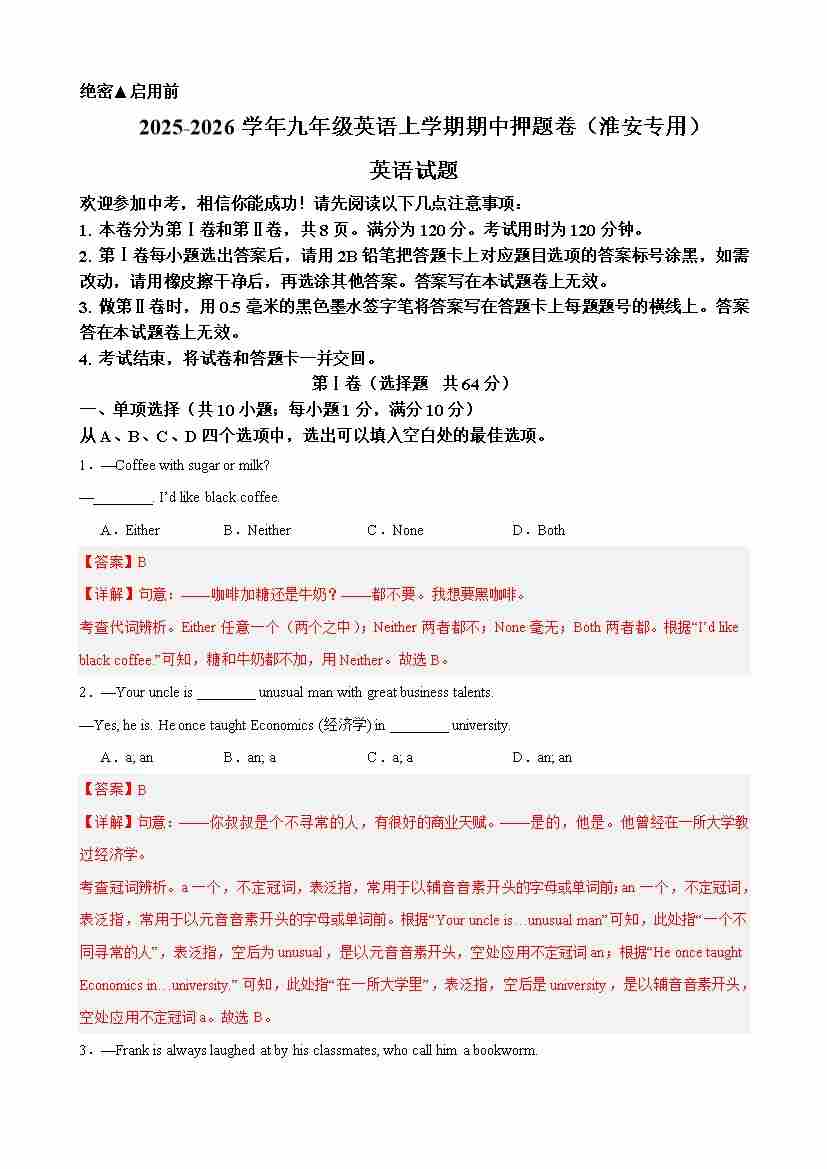 九年级英语上学期期中临考押题卷(淮安专用)(教师版)