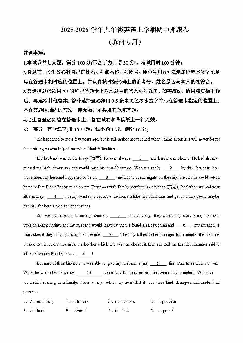 九年级英语上学期期中临考押题卷(苏州卷)(学生版)