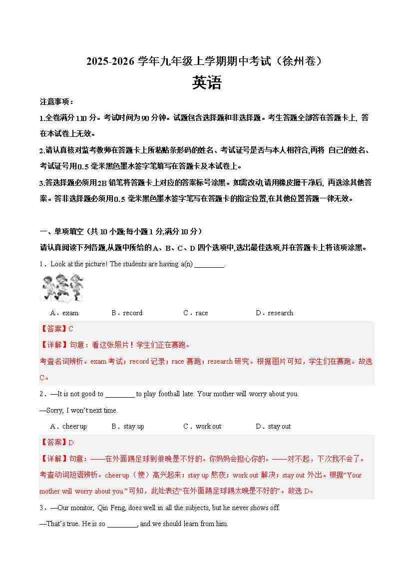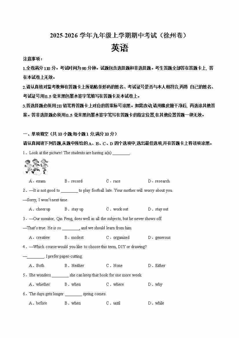 九年级英语上学期期中考试(徐州卷)(学生版)