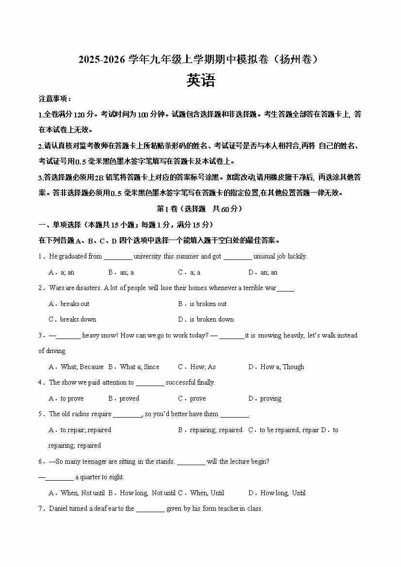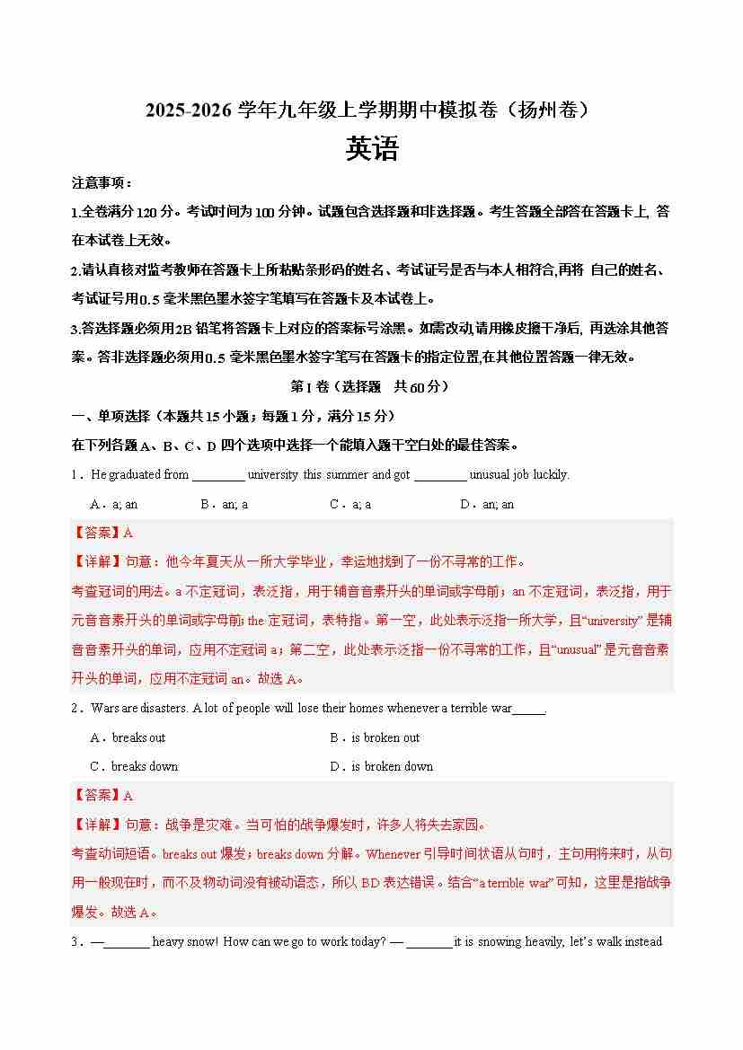 九年级英语上学期期中考试(扬州专用)(学生版)