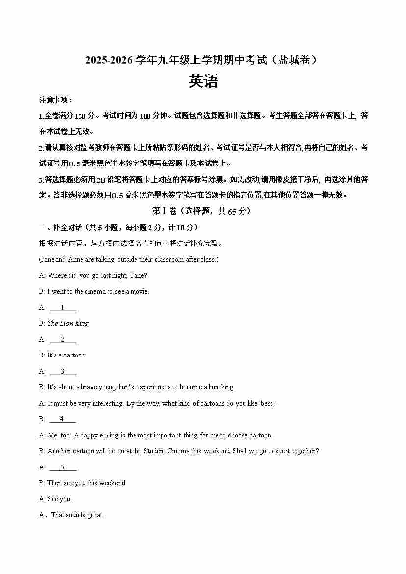 九年级英语上学期期中考试(盐城卷)(学生版)