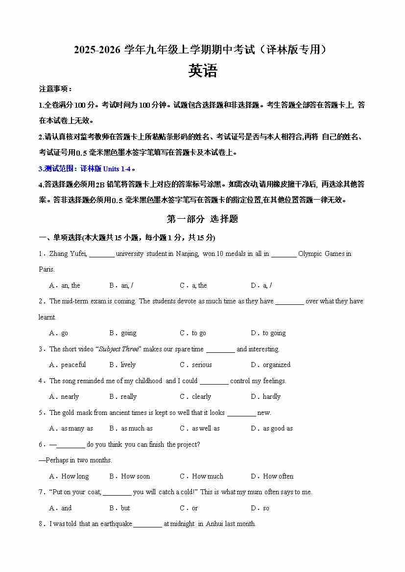 九年级英语上学期期中考试(译林版专用)(测试范围:Units 1-4)(学生版)