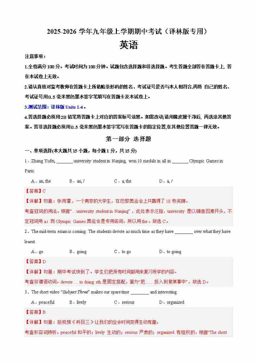 九年级英语上学期期中考试(译林版专用)(测试范围:Units 1-4)(教师版)