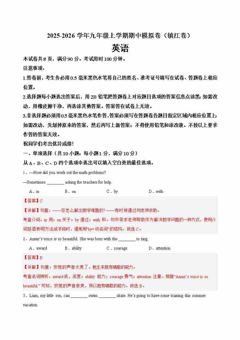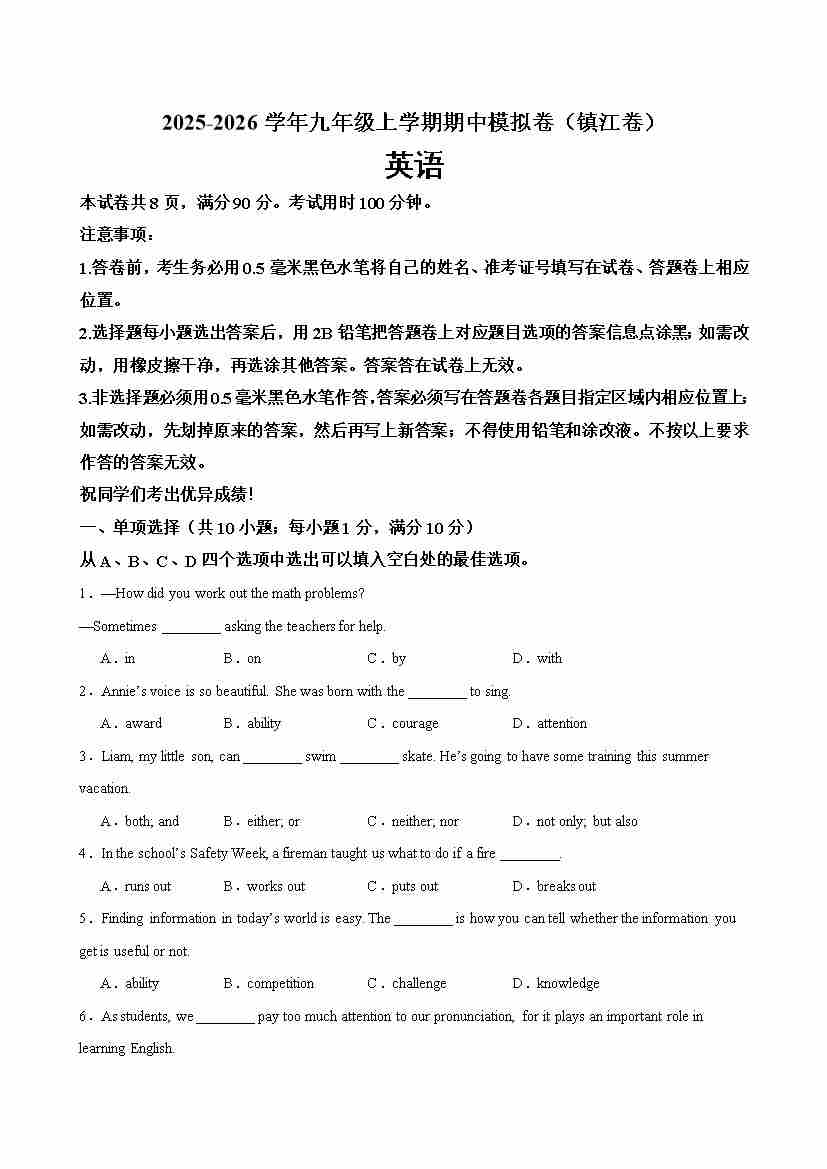 九年级英语上学期期中考试(镇江卷)(学生版)