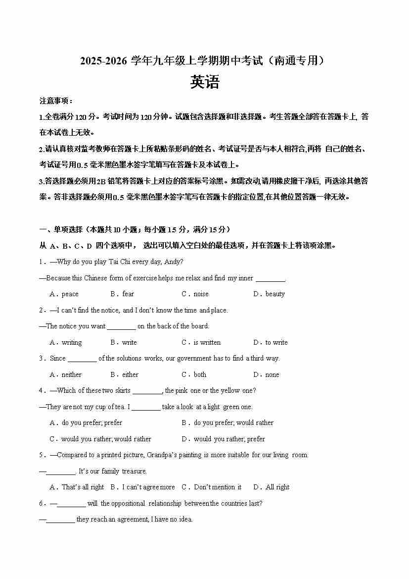九年级英语上学期期中考试(南通专用)(学生版)