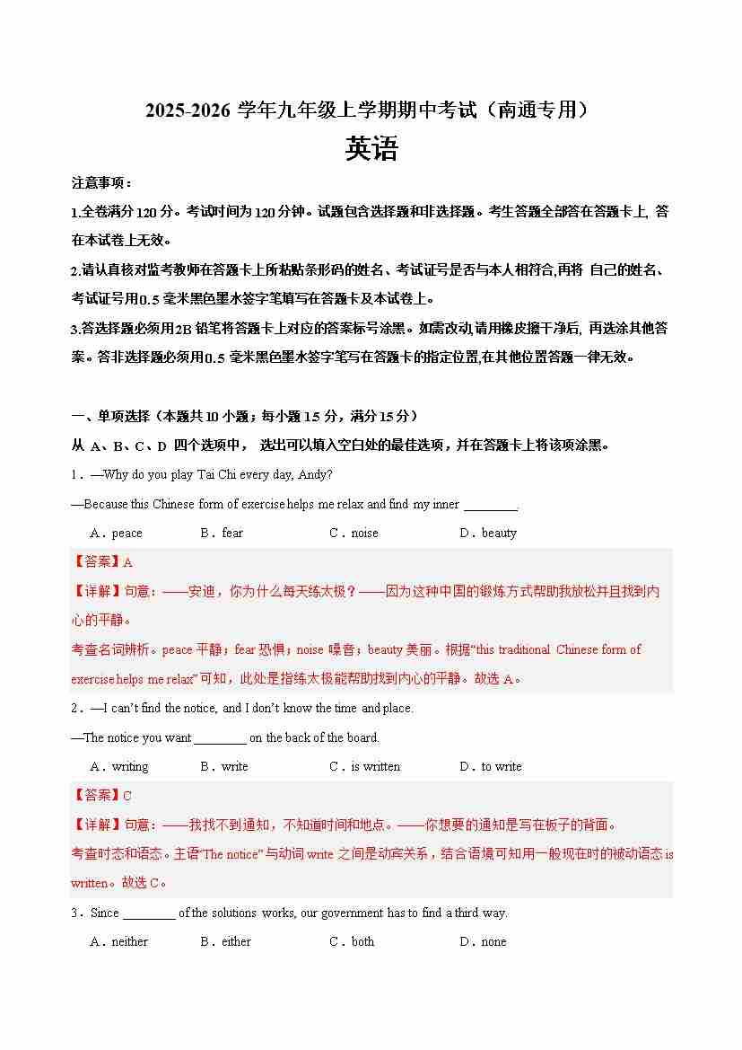 九年级英语上学期期中考试(南通专用)(教师版)