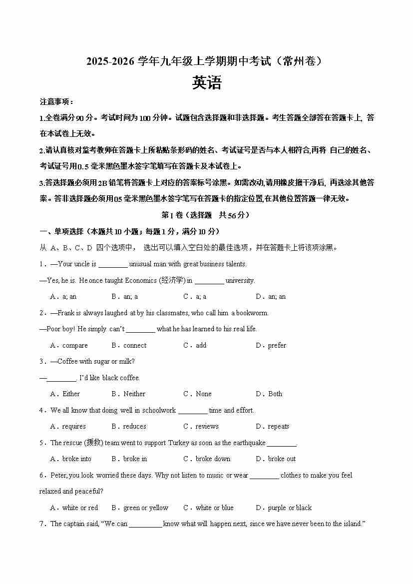 九年级英语上学期期中考试(常州卷)(学生版)